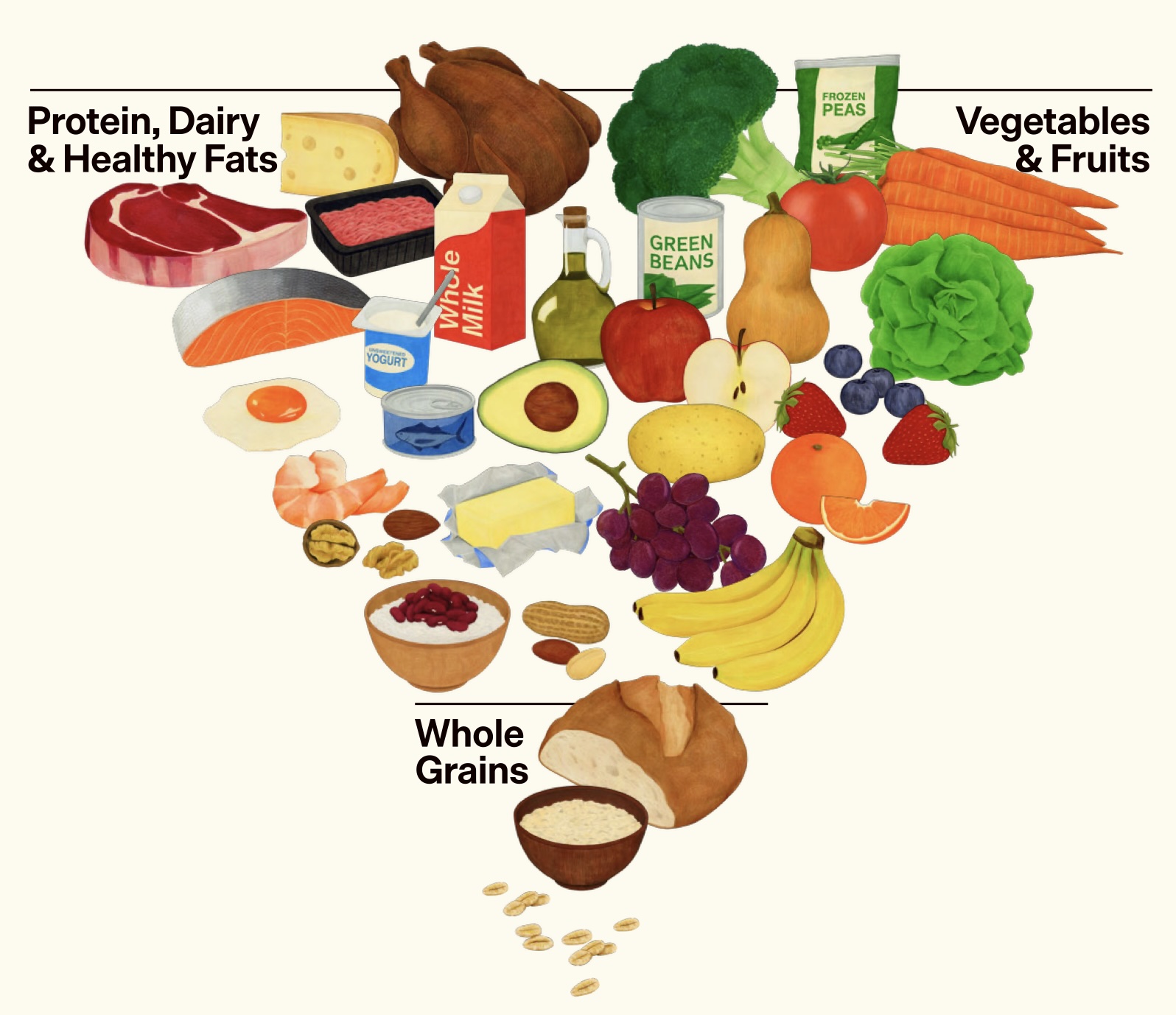 The confusion culminates in the overarching messaging and its visual representation. The new “inverted pyramid” graphic (Figure 2) presents an abstract hierarchy that arguably conflicts with the text it accompanies. It places a large emphasis on red meat, cheese, and whole poultry at the “top” (widest section), while relegating whole grains (and not even explicitly refined or processed grains) to the smallest point at the bottom.
